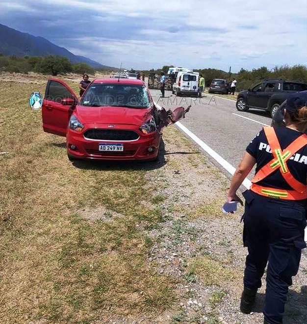 A su vez éste último fue impactado por un automóvil Ford Ka, de color rojo, dominio ADZ49NY, en el que circulaba Elda Martha Cordero (43), quien iba junto a Eliana Carina Ovejero (49), Ariel Alejandro Roldan (44) y Cesar Roldan (36), quedando a un costado de la banquina.