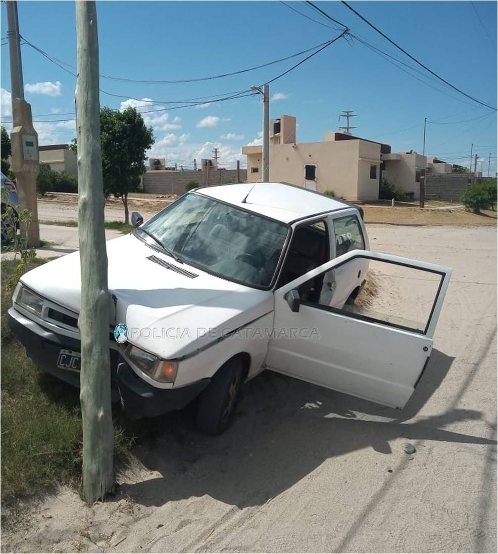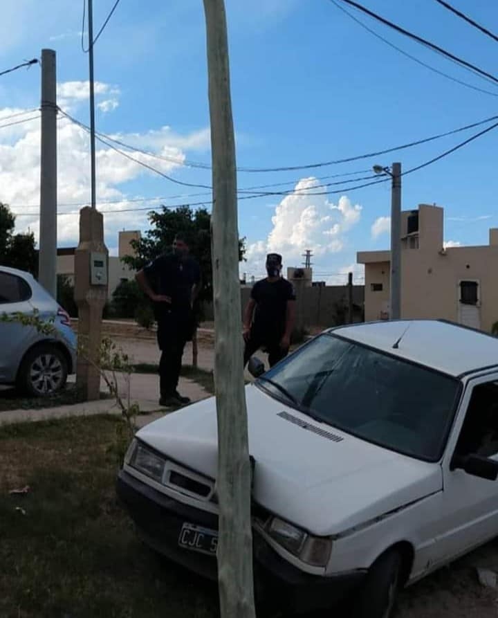 En la tarde de este sábado, a las 16.20, en la intersección de la Avenida N° 22 y calle N° 31, del Complejo Habitacional Valle Chico, se registró un siniestro vial protagonizado por un automóvil Fiat Uno, dominio CJC-552, de color blanco, al mando de Mario Noe Pierangeli (32), quien por motivos que se investigan perdió el control del rodado y chocó contra un poste del tendido eléctrico.