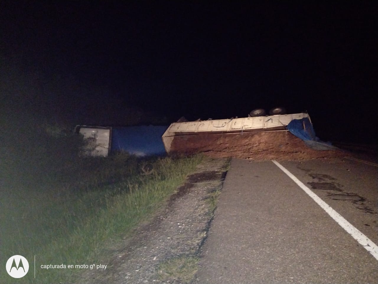 Por razones que se tratan de establecer, el conductor de un camión cargado de tierra, volcó sobre la calzada. El vehículo quedó atravesado en la ruta.