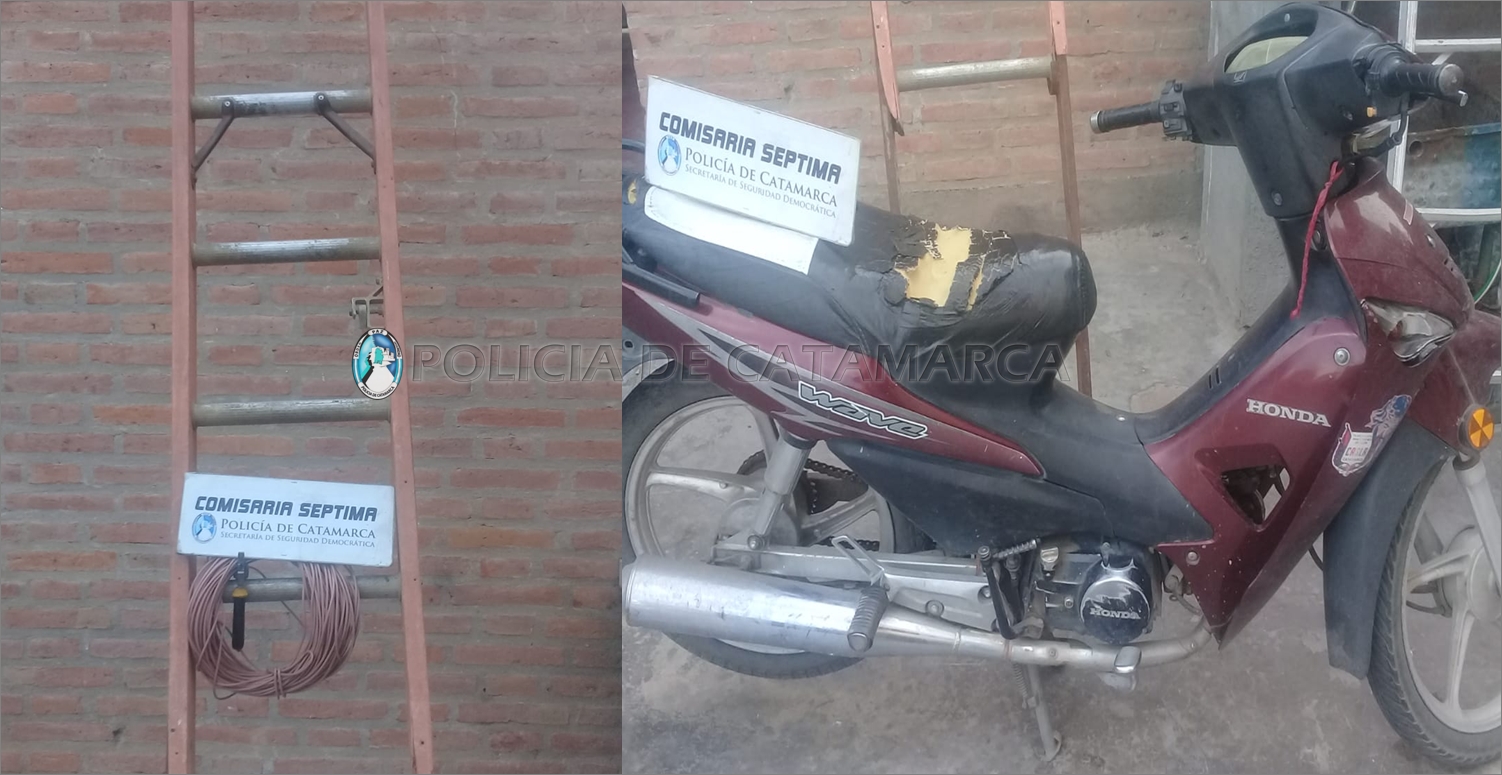 Inmediatamente, procedieron a su aprehensión, como así también secuestraron una escalera metálica anaranjada, un rollo de cables de color rosado, una pinza de corte y una motocicleta Honda Wave 110 cc., de color bordo.