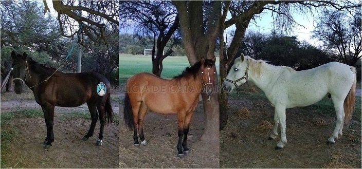 Según se informó, se trata de un caballo de pelaje moro blanco sin marca visible, un caballo pelaje tuco, miembro posterior izquierdo blanco, marca de fuego en pierna izquierda, EG-82, y un potro, pelaje vallo gateado, miembro posterior izquierdo blanco, sin marca de fuego visible.