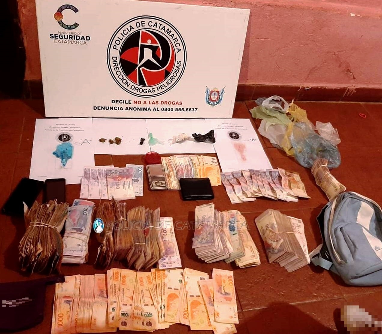 Tras irrumpir en el inmueble, los policías procedieron al secuestro de una balanza digital, una dosis de cocaína, recortes varios, un triturador, la suma de 320.570 pesos en efectivo, discriminados en billetes de distinta denominación, dos teléfonos celulares, tres envoltorios de plástico con una sustancia tipo herbácea y compactada, compuesta por hojas, tallos y semillas, los cuales al ser sometidos a la prueba de campo correspondiente arrojó que se trataría de 28 gr. de marihuana.