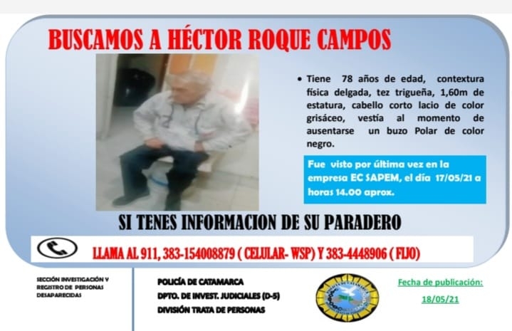 Se trata de Héctor Roque Campos, de 78 años, quien se ausentó de las instalaciones de la empresa EC SAPEM este martes, alrededor de las horas 14, mientras su hija estaba realizando trámites en el lugar.