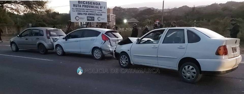 En el lugar, los policías constataron que un automóvil Volkswagen Polo, dominio BGW 120, de color blanco, conducido por Juan Carlos Brandan (53), quien iba en compañía de Patricia Analía Aramburu (40) y una niña de 8 años, por razones que son materia de investigación, colisionaron con un automóvil Ford Fiesta, de color blanco, dominio OIC 489, en el que circulaba Daniel Alberto Nieva (23) junto a Milagros Estefanía Rocha (20) y una niña de 2 años, quienes a su vez colisionaron con un automóvil Ford Fiesta, dominio FVW 352, de color Marrón, en el que se conducía Walter José Roberto Calderón (43), Gabriel Alejandro Córdoba (28), Dana Melisa Maturano (32) y Karen Johana Maturano (31), oriundos de la localidad de Huillapima, del departamento Capayán.