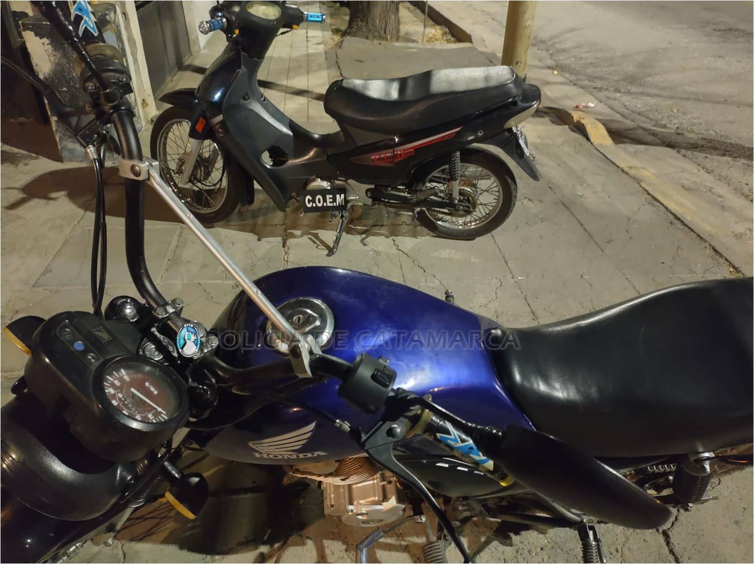 En el lugar, procedieron a la aprehensión de un joven de apellido Leiva de 23 años, quien circulaba en una motocicleta Honda CB1 de color azul, en compañía de otro masculino quienes estaban empujando una motocicleta Corven, Energy, negra de 110cc.