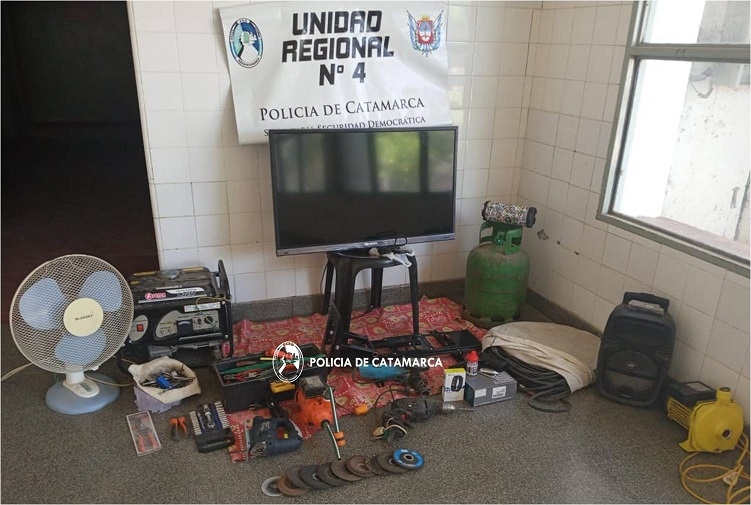 Tras averiguaciones practicadas, a las 11:15 de hoy jueves, personal de la Comisaría de Andalgalá logró recuperar un televisor tipo LCD 40 pulgadas, con su respectivo soporte; dos parlantes; un grupo electrógeno; una garrafa de gas de 10 Kg; una sierra caladora; un taladro; una amoladora y discos de corte; una pistola de aire comprimido; dos bombas de agua; un ventilador; un rollo cable y varias herramientas, que quedaron en calidad de secuestro.