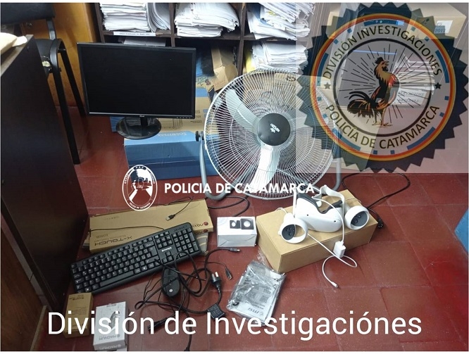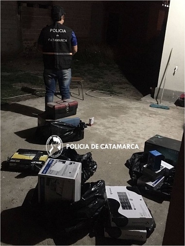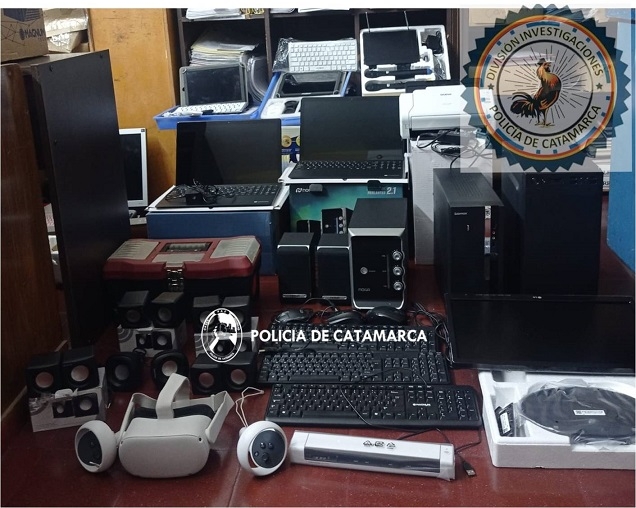 Personal de la División Investigaciones de la Policía de la Provincia materializó una serie de allanamientos y registros domiciliarios en diferentes puntos de la ciudad, logrando recuperar en total 2 monitores de 17 pulgadas, un ventilador de pie, 4 CPU, 9 teclados de computadora, 5 mouse de computadora, 6 parlantes de computadora, 3 impresoras, 2 notebook, 2 tablet completa con su maletín, un juego completo de micrófono, un home theater completo, una caja de herramientas con distintas juegos de llaves, y un proyector digital de pantalla, entre otros elementos.