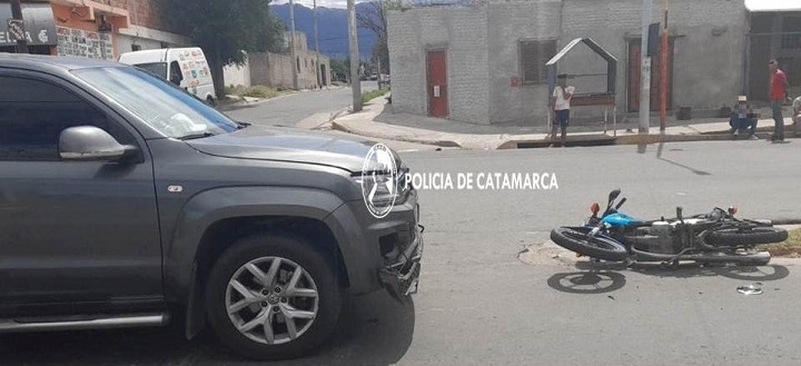 Hoy lunes, a las 13:20, en la intersección de avenida Manuel Navarro y calle Luis Borges, Claudio Daniel Manías (55), que circulaba en una camioneta VW Amarok gris, colisionó con una Honda CG Titán 150 cc. color celeste, al mando de Enzo Leonel Roldan (21).