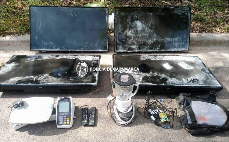 Tras una ardua tarea investigativa, personal de la División Investigaciones de la Policía de la Provincia realizó rastrillajes en un descampado ubicado la zona alta de la Capital y, en inmediaciones a la esquina de calles Arrayanes y Las Tuscas, observó entre las malezas los televisores cubiertos con arbustos.
