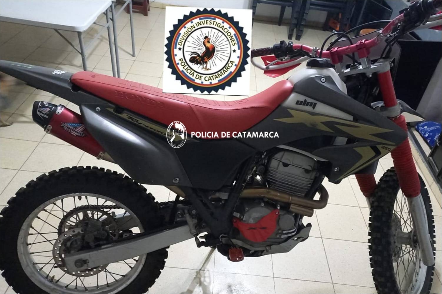 A raíz de una denuncia penal radicada en el Precinto Judicial N° 3, por un hombre mayor de edad, quien manifestó que personas desconocidas se habrían apoderado de su motocicleta Honda Tornado 250 cc., de colores gris y rojo, que estaba estacionada afuera de su domicilio ubicado en Banda de Varela, tras una ardua tarea investigativa, en la jornada de ayer, efectivos de la División Investigaciones junto a sus pares de la División Sustracción de Automotores llegaron hasta una vivienda de la calle Olmos de Aguilera, de la localidad de Santa Rosa, Departamento Valle Viejo.