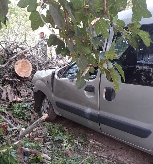A raiz de los fuertes vientos que se registraron durante la mañana, un árbol de gran porte se desplomó y aplastó parte de un vehículo utilitario que estaba estacionado, propiedad de un hombre de apellido Fernández.
