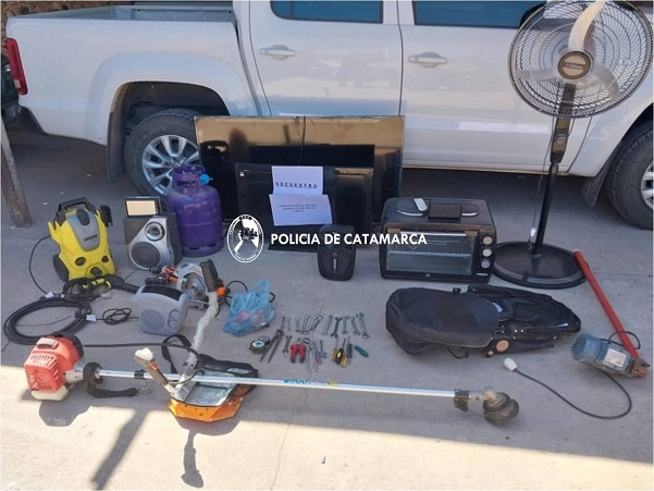 En el lugar recuperaron un ventilador marca Liliana, una garrafa de gas de 10 Kg., una motoguadaña Black & Decker, una bomba de agua Gama, dos televisores marcas Sony y RCA, de 32 y 55” pulgadas, dos parlantes inalámbricos, un taladro eléctrico Dowen Pagio, una sierra circular marca Daewoo, una hidrolavadora marca Karcher K3 Premium, un horno eléctrico Marshall, un caloventor, un estéreo, un bolso con varias llaves y otros elementos, que quedaron en calidad de secuestro al igual que un automóvil Fiat Uno perteneciente a una empresa de remises, el cual era utilizado para cometer los ilícitos.