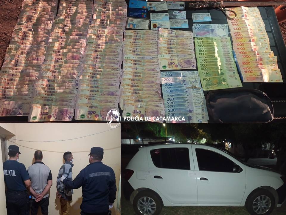 Conforme una denuncia penal radicada en la Comisaría de Saujil, por un hombre de 29 años, quien manifestó que personas desconocidas habrían ingresado a una sucursal del correo argentino, de esa localidad del Departamento Pomán, para luego sustraer dinero en efectivo, encomiendas y retirarse del lugar, tras realizar averiguaciones, personal de calle de esa dependencia logró establecer quienes serían los presuntos autores del ilícito, en virtud de lo cual alertó a sus pares de la Comisaría Departamental Chumbicha y anoche a las 22:00 en una estación de servicio ubicada en la Ruta Nacional N° 38, demoraron un automóvil Renault Sandero blanco en el que circulaban los masculinos y tras inspeccionar el rodado, recuperaron ciento cuarenta y ocho mil veinte pesos ($148.020) en efectivo y prendas de vestir, que quedaron en calidad de secuestro, como así también procedieron a la aprehensión de los ocupantes de apellidos Santillán (29) y Vacazur (50).