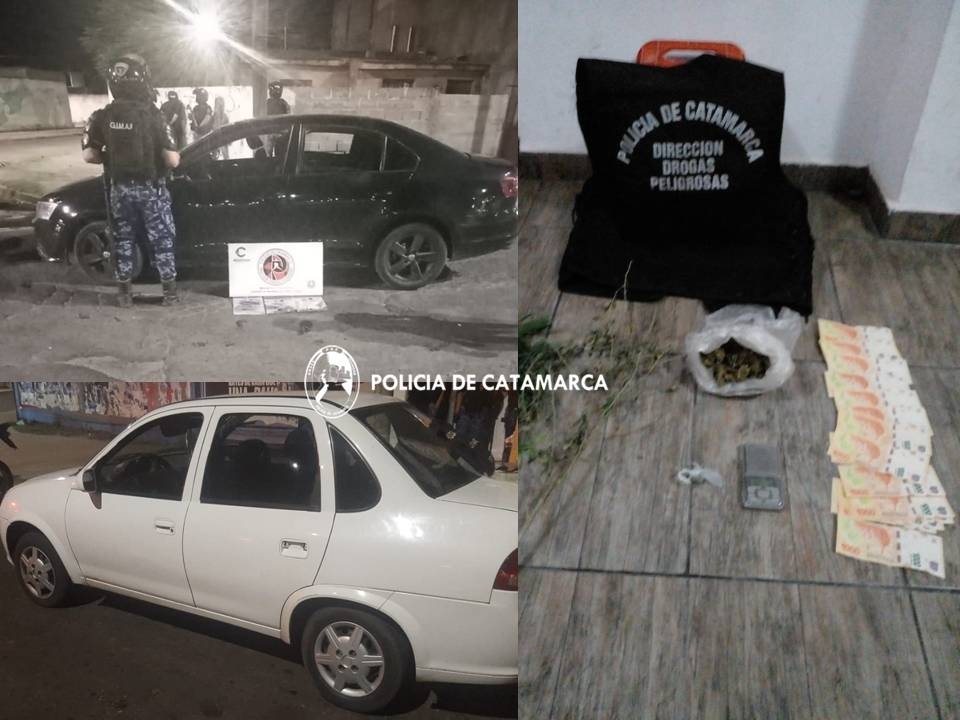 Al finalizar con las medidas Judiciales, los policías secuestraron Marihuana y Cocaína, varias semillas y plantines de la variedad Cannabis Sativa, una (01) balanza tipo gramera, cuatro (04) teléfonos celulares, la suma de ciento ochenta y dos mil doscientos noventa pesos ($182.290) en efectivo, el rodado mencionado y un Chevrolet Corsa Classic blanco, como así también procedieron a la detención de dos masculinos mayores de edad, quienes quedaron alojados a disposición de la Justicia interviniente.