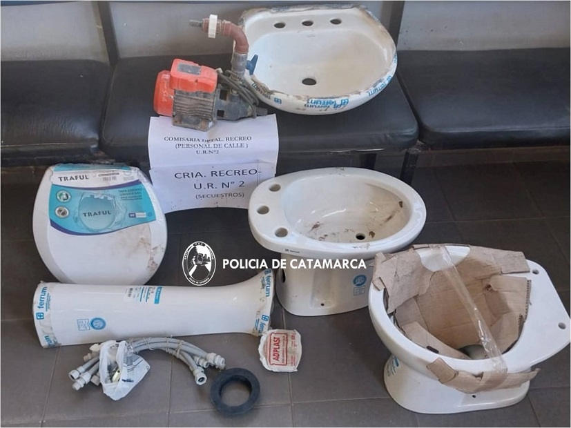 En el lugar un hombre hizo entrega de forma voluntaria de un inodoro Ferrum con tapa, un bidet marca Ferrum, un lavatorio con su pie marca Ferrum, una bomba de agua marca Daewoo y otros elementos que había adquirido de buena fe, en virtud de lo cual quedaron en calidad de secuestro a disposición de la Fiscalía de la Sexta Circunscripción Judicial, desde donde impartieron las medidas a cumplimentar.