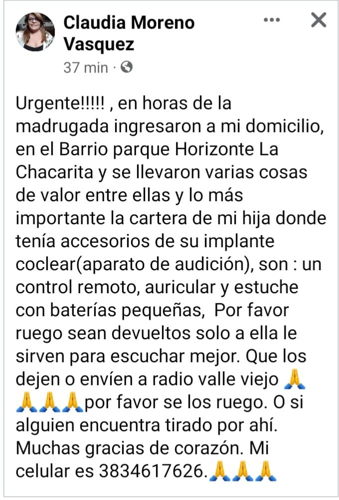 Ayer ladrones ingresaron en un domicilio en el barrio La Chacarita y se llevaron una cartera que contenía un implante coclear de una joven que lo necesita con suma urgencia para escuchar ya que padece problemas auditivos. Quien lo haya encontrado se ruega su devolución: 3834617626
