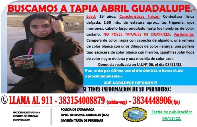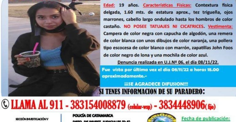 Características de la Contextura física; delgada, 1.60 mts. de estatura aprox, tez trigueña, ojos marrones, cabello largo ondulado hasta los hombros de color castaño