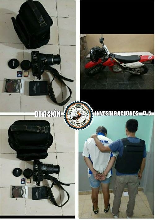 Finalmente, los policías logaron recuperar un bolso de tamaño pequeño, de color negro; una cámara fotográfica NIKON D 5600; una tarjeta de memoria Transcend de 16 GB; una batería recargable Nikon; un cargador de batería Nikon; una tarjeta de memoria SanDik de 16 GB; un lente Digieye, de 52 milímetros; dos tapas de lentes Nikon; y una motocicleta Motomel X3M, 125 cc., de colores rojo y blanco, que quedaron en calidad de secuestro, a disposición de la Justicia Interviniente.