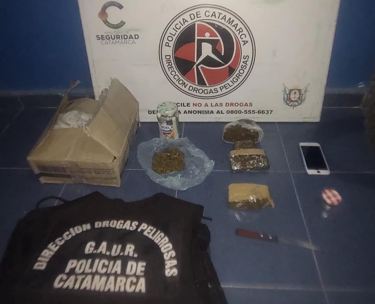 En la oportunidad se procedió al secuestro de tres trozos de una sustancia compacta tipo vegetal compuesta por hojas tallos y semillas, con un peso de 601 gr. que al ser sometida a prueba de campo arrojó resultado positivo para cannabis sativa y un frasco de vidrio conteniendo en su interior 12 gr. de cogollo de marihuana.