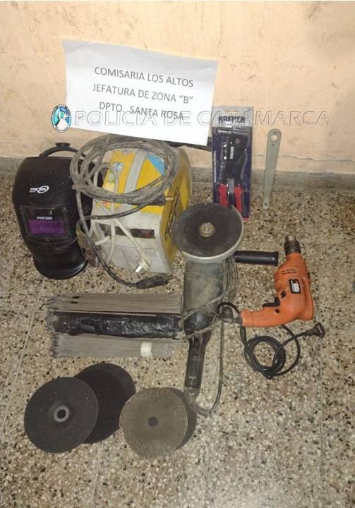 Finalmente, en la noche de ayer, a las 23:30, a raíz de las tareas investigativas realizadas, los efectivos policiales realizaron un rastrillaje en la vera de la Ruta Nacional N° 64, donde observaron oculto entre la maleza una (01) soldadora de color amarillo, una (01) máscara de protección, un (01) taladro marca Black Decker, una (01) amoladora verde oscura marca Bosh, una (01) remachadora de color rojo y aproximadamente cinco (05) kilogramos de electrodos, que serían los elementos sustraídos, los que quedaron en calidad de secuestro.