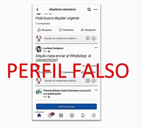 Ø Las personas afectadas suelen ser oriunda del interior provincial, que tiene la necesidad de contratar un alquiler de un departamento, una vivienda, por cuestiones laborales, de estudio, y otras situaciones. Estas personas buscan información por las redes sociales y encuentran en algunos grupos de Facebook, rubro “compra/venta Catamarca-ofrecimiento de alquileres”, publicaciones de este tipo donde también figura un número telefónico aportado por los estafadores, los que suelen poseer prefijo de las provincias de Mendoza (261), Neuquén (299), Córdoba (351), Buenos Aires Provincia, por lo que esto ya debería poner en ALERTA a la persona que busca alquiler.