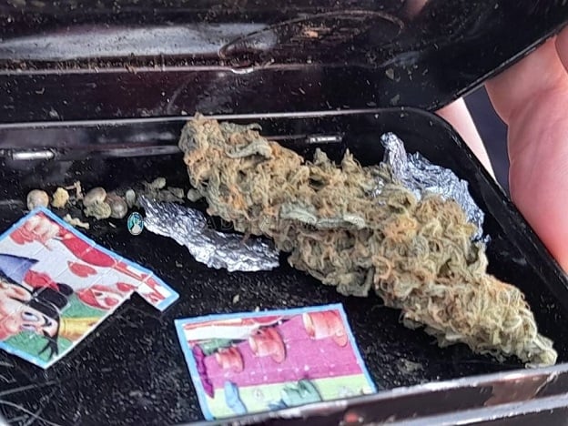 Al inspeccionar, se comprobó que en el interior había una sustancia tipo herbácea, por lo que se solicitó la colaboración de pares de la Dirección Drogas Peligrosas, quienes tras realizar la prueba de campo correspondiente, se determinó que se trataba de dos tabletas con 46 celdas de LSD, y picadura y cogollos de Marihuana.