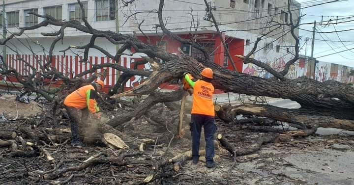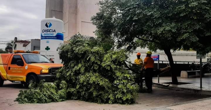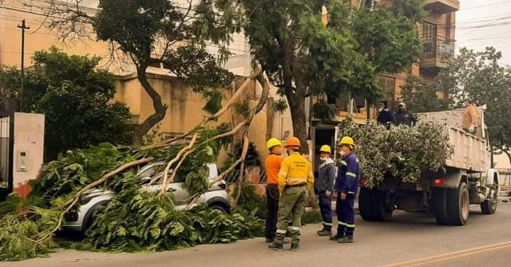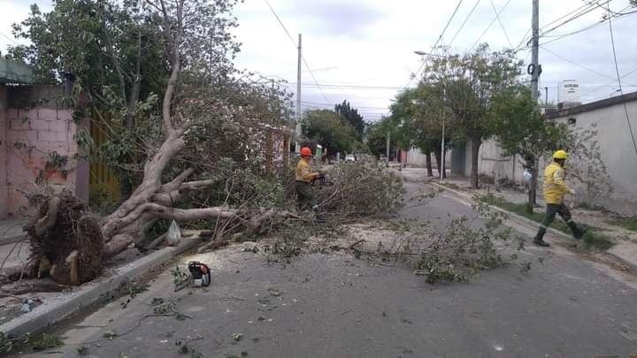 Junto a personal de Incendios Forestales, EcSapem y municipio de la Capital, trabajan sobre árboles de gran porte que fueron afectados por el temporal en distintos puntos del Valle Central.