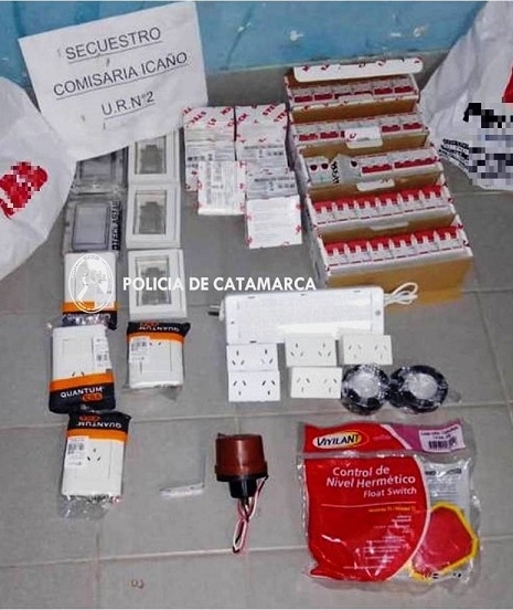 Tras averiguaciones practicadas, policías materializaron un registro domiciliario en una vivienda ubicada en la calle Púbica S/N° del barrio Centro, en donde recuperaron cuatro cajas de llaves térmicas, siete diferenciales, luz de emergencia, un fotocontrol, un control de nivel hermético, seis llaves de toma duales, tres cajas plásticas rectangulares, que quedaron en calidad de secuestro.