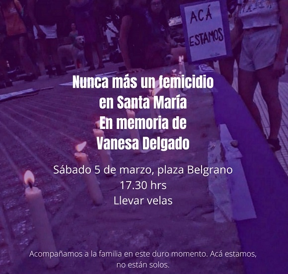La agrupación FemiCoyas convocó para hoy sábado 5 de marzo a las 17 en la plaza Belgrano de la ciudad de Santa María a una nueva marcha reclamando justicia por el femicidio de Vanesa Delgado.