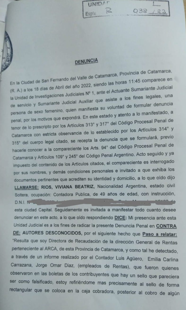 La presentación en la justicia fue efecturada por Viviana Ríos, directora de Recaudación de la Dirección Provincial de Rentas.