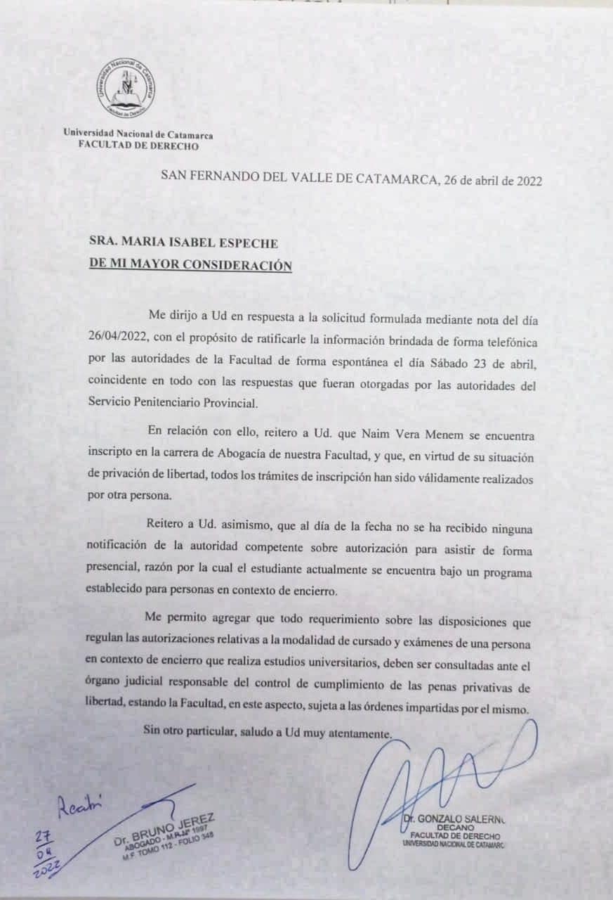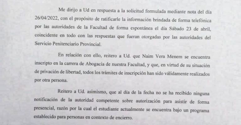 Sebastián Ibañez, el abogado defensor de María Espeche, detalló que el decano de la Facultad de Derecho, Gonzalo Salerno, finalmente respondió y confirmó positivamente que Naim Vera, condenado por el asesinato de Brenda Gordillo, está cursando la carrera de abogacía de manera virtual intramuros.