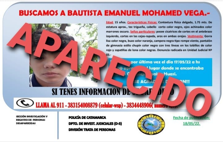 La División Trata de Personas de la Policía de Catamarca informó que el adolescente de 15 años identificado como Bautista Emanuel Mohamed Vega fue ubicado en la tarde de este jueves.