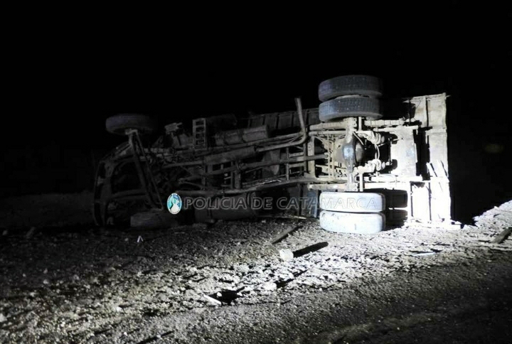 Anoche a las 21 horas aproximadamente, se toma conocimiento que en el kilómetro 1398 de la Ruta Nacional N°60, se produjo un siniestro vial con resultado fatal. En el lugar efectivos de la Comisaría de Fiambalá, Dpto. Tinogasta, constataron que un camión Mercedes Benz, modelo 1114, dominio WQD551, se encontraba volcado sobre su lateral izquierdo, en la cabina se encontraban tres personas, identificados como Antonio Alcides Perea (39) domiciliado en el barrio Pampa Blanca, Fiambalá, quien circulaba en compañía de su hijo, un niño de 12 años de edad y de su sobrino Fernández Fabián (22) quien se domicilia en Localidad de Anillaco, Dpto. Homónimo. El conductor del camión Perea, perdió la vida en el lugar del hecho, producto de las lesiones sufridas.