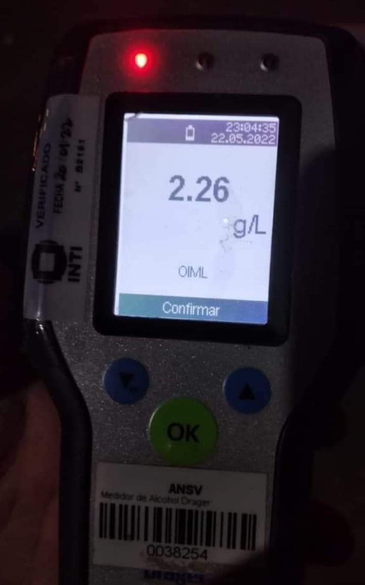 El test de alcoholemia realizado por personal de la Dirección de Tránsito Municipal de Valle Viejo arrojó como resultado 2.26 grs. de alcohol por litro de sangre. Posteriormente se procedió al secuestro del vehículo.