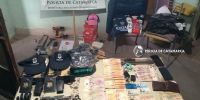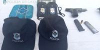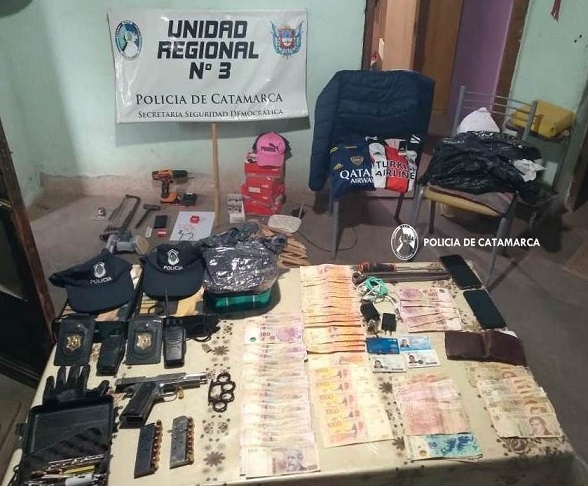 En ese lugar se procedió al secuestro de un arma de fuego, calibre 11.25, numeración y marca limada, con dos cargadores, con 7 proyectiles cada uno, 2 placas pertenecientes a la Policía de la Provincia de Bs. As., 2 gorras de la Policía de Bs. As, indumentaria deportiva varias, de distintas marcas; 2 teléfonos celulares, marca Motorola, de color negro, y el otro de marca TCL, del mismo color, la suma de $29.550, discriminados en billetes de distintas denominaciones, 2 Equipos de comunicación HT marca Gadnic Baofeng, con cargador; joyas varias, (anillos, aros y cadenas), que podrían estar vinculadas con otro hecho ilícito acaecido en esa Ciudad, documentación varias a nombre de un masculino Arce, herramientas de mano y eléctricas varias.
