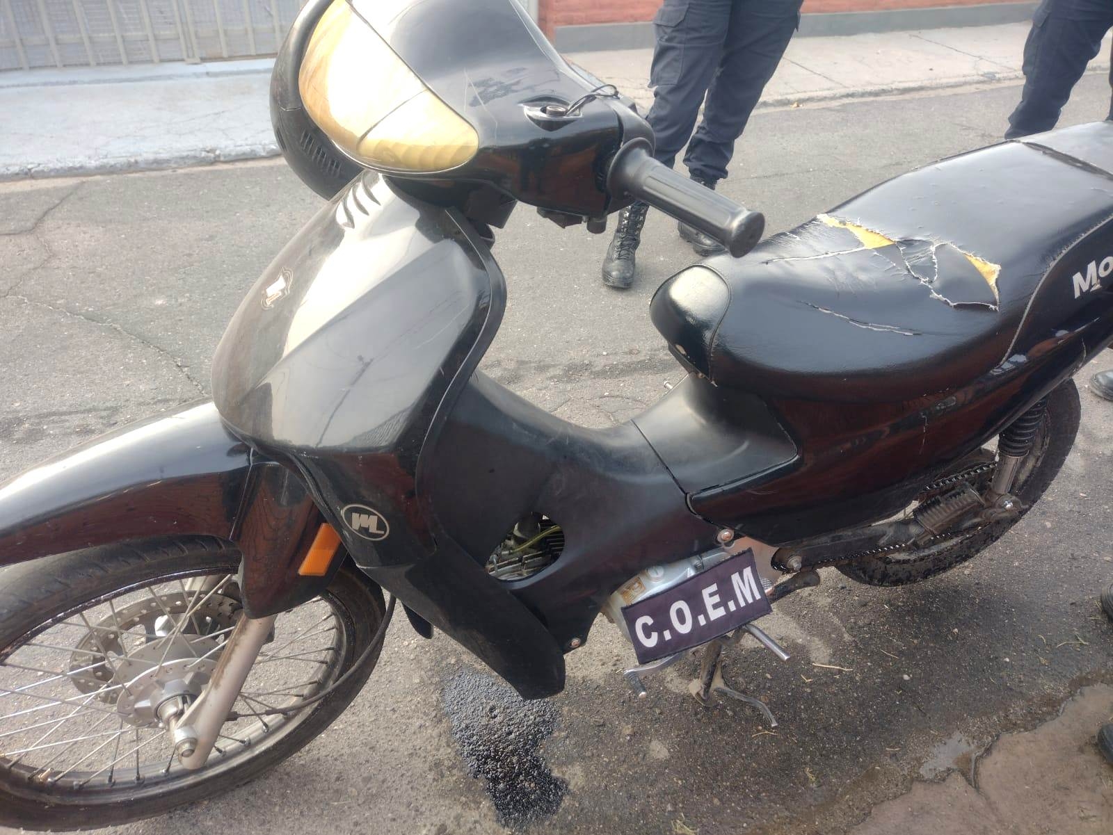 Hoy, a las 09:45, y por requerimiento del Sistema de Atención de Emergencia SAE-911, personal del COEM Kappa, llegó al Pasaje Esquiú entre las calles General Roca y Obispo Esquiú, donde entrevistaron a una mujer de 72 años de edad, quien manifestó que frente a su domicilio estaba una motocicleta Motomel Bliz 110 cc., dominio 783-KLJ, de color negro, con un casco de color negro abandonada desde horas tempranas.