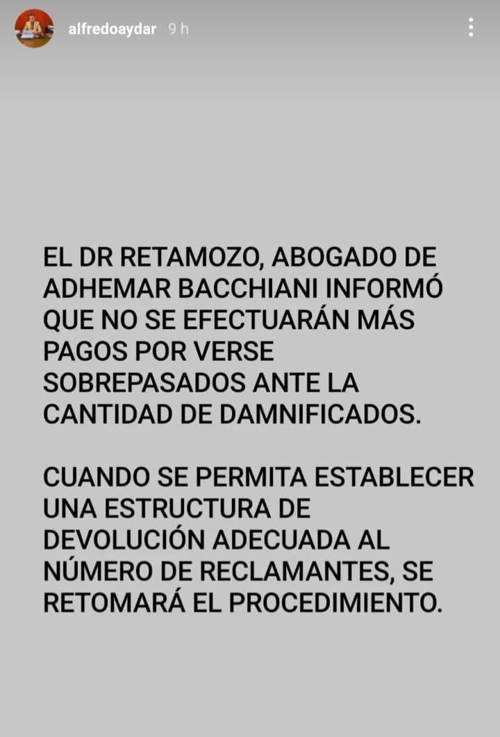 Aydar explicó que el abogado Lucas Retamozo, defensor de Bacchiani, le comunicó que cesará en los pagos debido a que se vieron sobrepasados con la cantidad de demanda de pagos de ahorristas y al no contar con los recursos humanos y técnicos suficientes para dicha tarea.