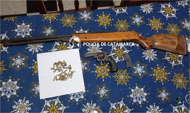 Por tal motivo, los uniformados materializaron una orden de registro domiciliario dispuesta por el fiscal de instrucción en turno, en una vivienda ubicada en barrio San Martín S/N de la localidad de Chumbicha, donde procedieron al secuestro de un revólver calibre 22mm, de una carabina calibre 22 mm., y 34 cartuchos del mismo calibre, mientras que el denunciado quedó supeditado a la persecución de la causa.