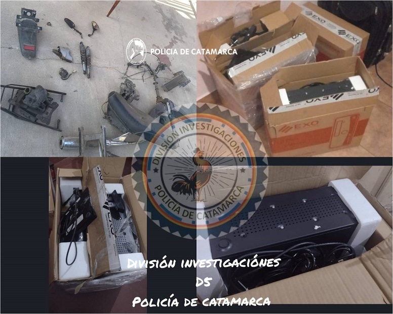 Tras realizar tareas de su especialidad, personal de la de la División Investigaciones de la Policía de la Provincia llevó a cabo un allanamiento en un inmueble ubicado en la manzana N° 46, del barrio Los Médanos, donde logró recuperar dos PC Exo Ready D1, un lector de huellas, un monitor LED, marca EXO, un pads de firmas, una PC, marca EXO, modelo READY DI, y una webcam. Todo quedó en calidad de secuestro. Asimismo, se incautaron varias motopartes de una motocicleta 110 cc., hasta determinar su legítima propiedad y procedencia.