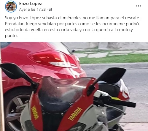 López contó lo ocurrido a través de cuenta de Facebook, a donde ofreció recompensa a quien pudiera aportar datos sobre su motocicleta.