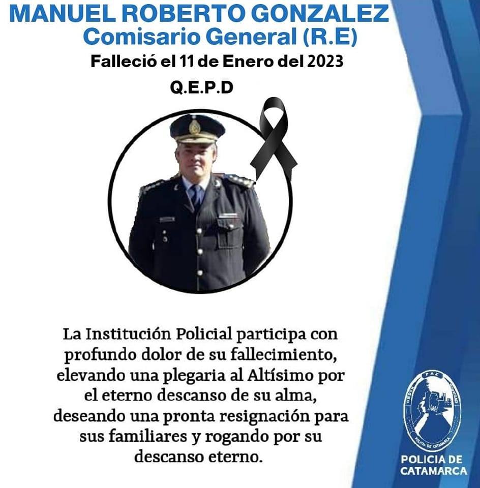 Un profundo pesar causó la noticia del fallecimiento del Comisario General (RE) Manuel Roberto González de 52 años, tanto entre sus camaradas como en amigos de la infancia y escuelas primarias y secundaria. Desde la fuerza comunicaron su deceso y congoja.