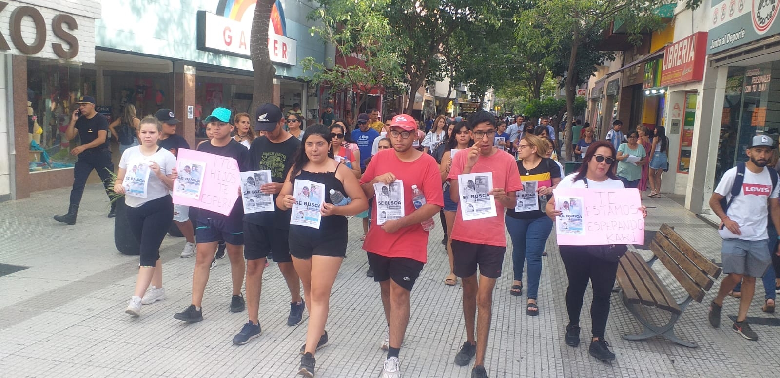 La columna partió desde Plaza 25 de Agosto y recorrió peatonal Rivadavia. Además, se realiza la entrega de volantes con la foto de Milagros Nahir y de Karina Verónica.