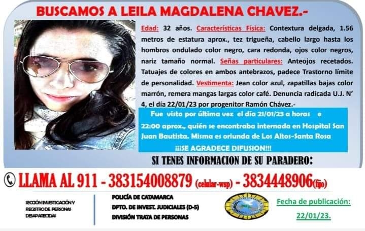 La mujer es oriunda de la localidad de Los Altos, departamento Santa Rosa, permanecía internada en el área de Salud Mental del Hospital San Juan Bautista y se ausentó del nosocomio alrededor de las 22 horas de ayer.