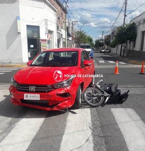 Hoy viernes, a las 15:55, en la intersección de las calles Mate de Luna y Junín, Fernando Alexander Tapia (35) que conducía un Fiat Cronos, de color rojo, colisionó con una Corven 110 cc; de color negro, en la que iban Santiago Jesús Ibáñez (18) y Paola Natalia Murillo (41).