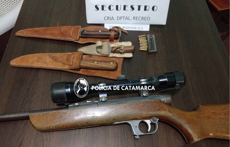 Ayer miércoles, a las 19:00, policías realizaron un registro domiciliario en un inmueble del barrio La Calera, de la ciudad de Recreo, propiedad de la familia Santillán, donde secuestró una carabina marca Mahely calibre 22 con mira telescópica, diez proyectiles del mismo calibre y tres cuchillos de diferentes tamaños, que quedaron a disposición de la Fiscalía de la Sexta Circunscripción Judicial, desde donde se indicaron las medidas a seguir.