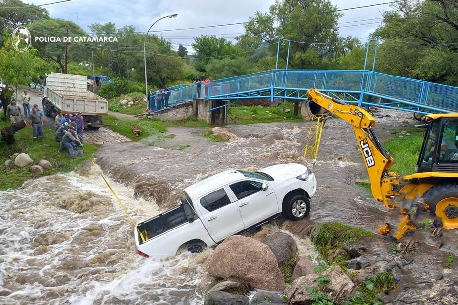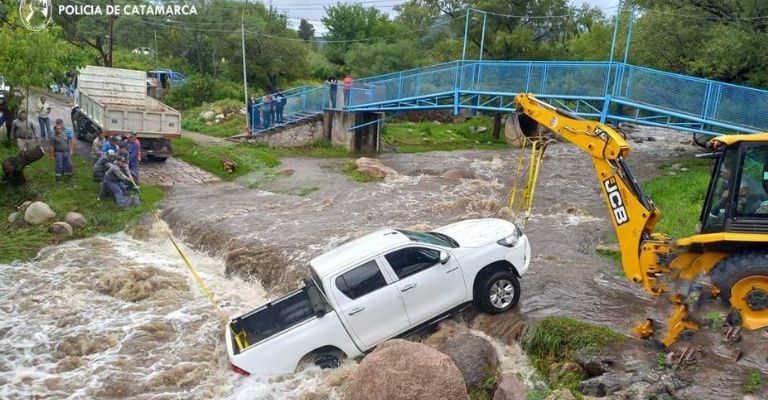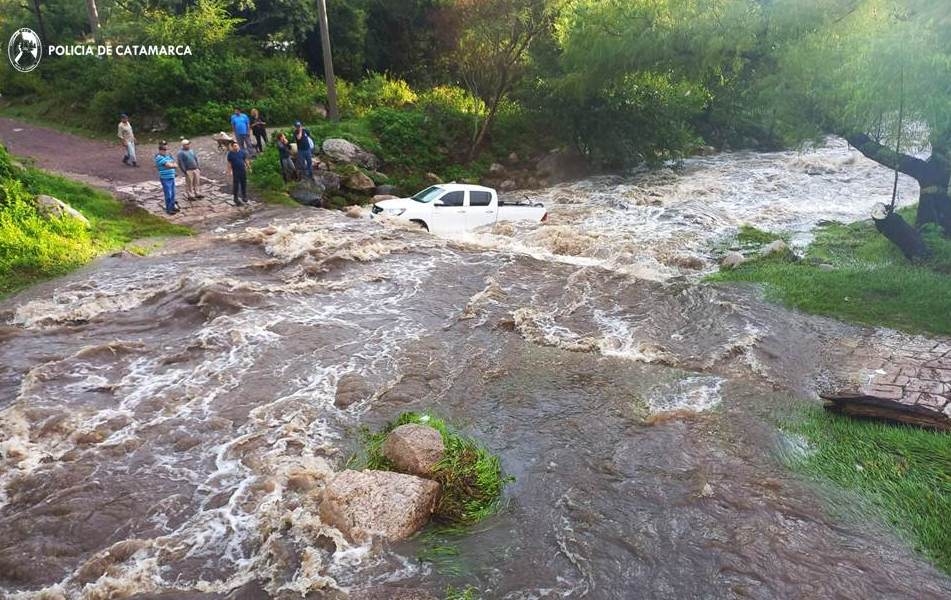 En la mañana de hoy, a las 08:30, a través de un llamado telefónico, efectivos de la Comisaría El Rodeo tomaron conocimiento que en el badén del Río Los Nogales, de esa localidad del Departamento Ambato, una camioneta Toyota Hilux, dominio AC501ZN, de color blanco, habría sido arrastrada por el agua.