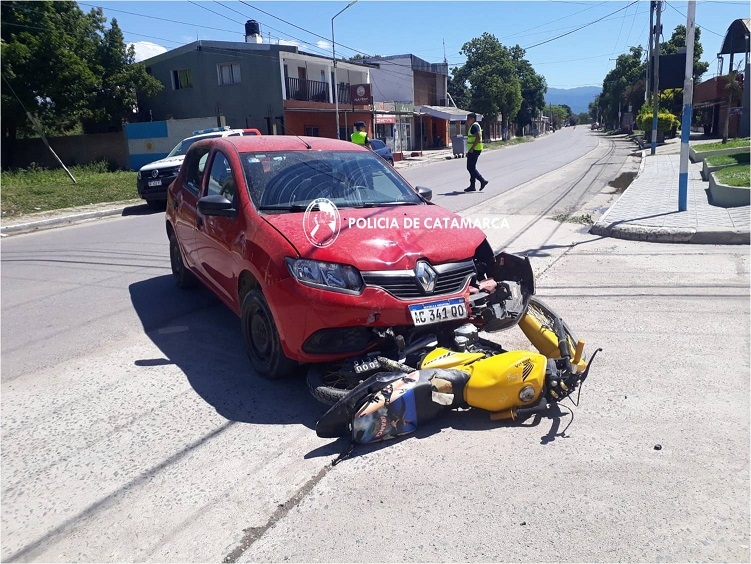 Hoy martes, a las 14:00, en la intersección de avenida San Martín y calle Mate de Luna, de la localidad de Los Altos, Rosa Mirta Chávez (66), que circulaba en un Renault Sendero rojo, colisionó con una Honda CG 150 cc., amarillo, conducida por Sol Abigail Gómez (22).