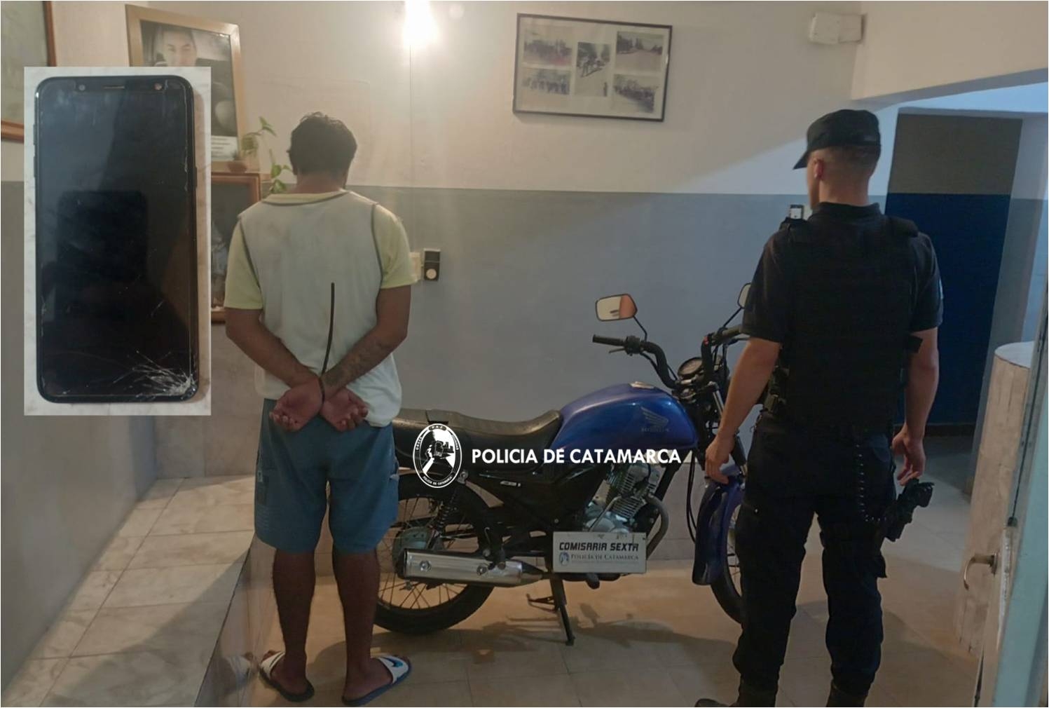 De inmediato, los uniformados se entrevistaron con un Oficial Subinspector de Policía, que estaba franco de servicio, quien manifestó que mientras se encontraba en el interior de su domicilio habría escuchado gritos de una mujer pidiendo auxilio, por lo que al salir se percató que dos desconocidos a bordo de un vehículo, intentaban sustraerle elementos mediante la modalidad delictiva de arrebato, en virtud de lo cual rápidamente intervino y procedió a la aprehensión de uno de los presuntos autores, un hombre de apellido Baigorri (30), y al secuestro de una motocicleta Honda CB1 125 cc., de color azul, mientras que el restante se dio a la fuga a pie.