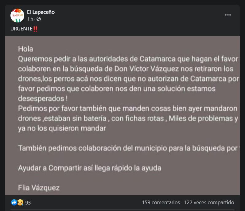Sin embargo, a partir de un mensaje publicado en el medio "El Lapaceño", la familia Vázquez aclara que han "retirado los drones y los perros", aludiéndose a una "falta de autorización".