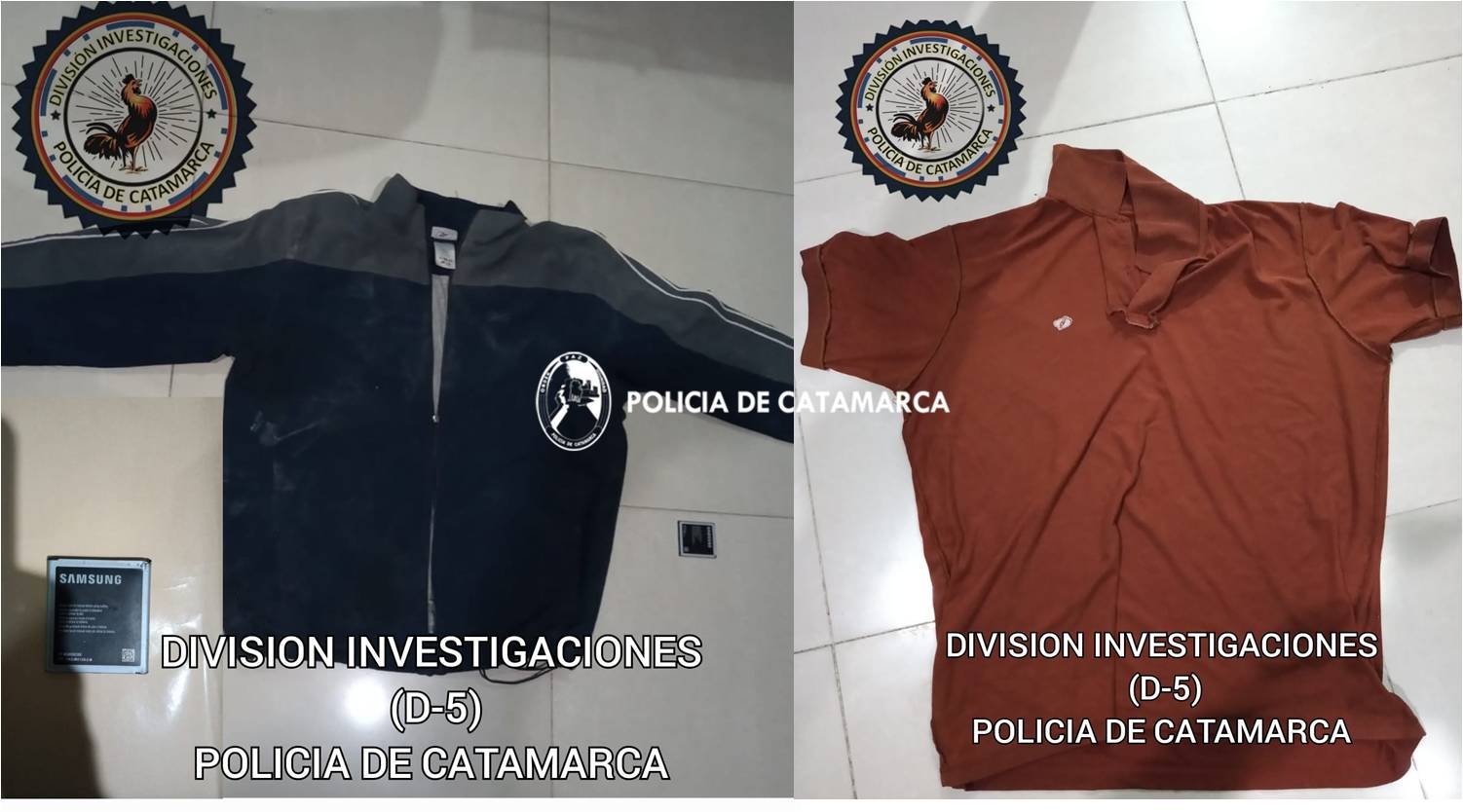 Al finalizar las medidas Judiciales, los Policías encontraron una batería para celular Samsung J 7, que quedó en calidad de secuestro al igual que una (01) chomba bordó y una (01) campera de color azul con detalles grises, las cuales habrían sido utilizadas por el presunto autor para perpetrar los ilícitos, recordando que aquel día, a las 13:50 horas, en la esquina de la calle Rafael Jijena y Avenida Los Minerales habría cometido otro arrebato y en la huida perdió el control de una motocicleta Motomel Blitz negra 110 cc., la cual dejó abandonada en el lugar continuando la fuga a pie.